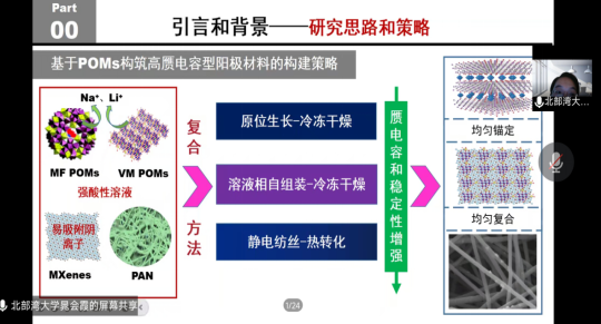 孟祥桐副教授主要分享了课题组围绕设计合成廉价且性能优异的染料敏化太阳能电池DSCs对电极材料,通过缺陷工程和表面工程的调控来构筑功能碳材料,介绍数种碳基对电极材料的设计制备及本征构效关系的调控方法,包括氮掺杂石墨烯纳米带、硒掺杂石墨烯、高含氮量掺杂碳量子点等功能碳材料,巧妙的利用多级结构和设计调控得到了高催化活性、低成本的电化学功能材料。晁会霞高级工程师分享了她最近的研究工作,以杂多酸、MXenes和碳纤维为基础,通过界面调控和复合方法的改进制备了系列杂多酸基复合材料用于阳极储锂/储钠,为杂多酸材料在储能领域的应用提供基础研究数据和制备方案。